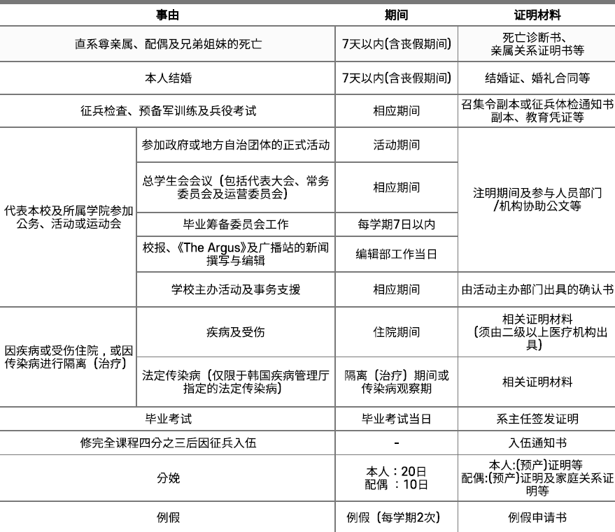 提交【请假申请(유고결석계)】及【证明材料】。逾期提交将不予受理。