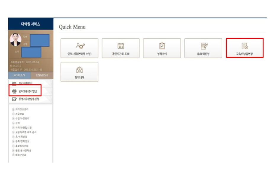 4) 在学证明书(从学校官网点击登录 “종합정보시스템” 申请并打印)
